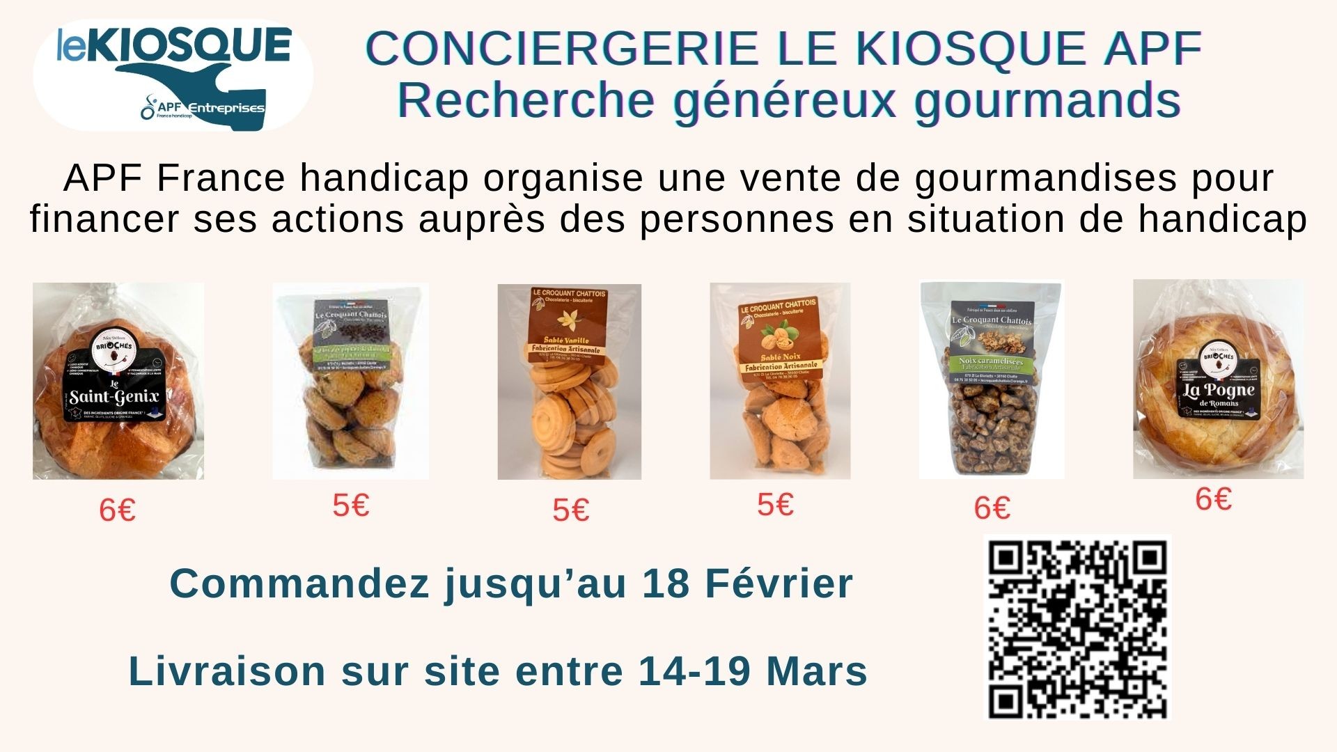 APF France handicap de l'Isère organise une vente de gourmandises au profit de ses actions en direction des personnes en situation de handicap.Les pognes, saint Genis proviennent de l'entreprise "Les délices briochés" à Romans sur Isère et les sablés du Croquant Chattois situé à Chatte.Retrouvez ou découvrez nos produits locaux et passez commande directement sur le site de l'APF via ce lienLes commandes sont à passer avant le 18 Février et seront livrées directement aux permanences du KIOSQUE sur votre site entre le 14 et le 19 Mars -